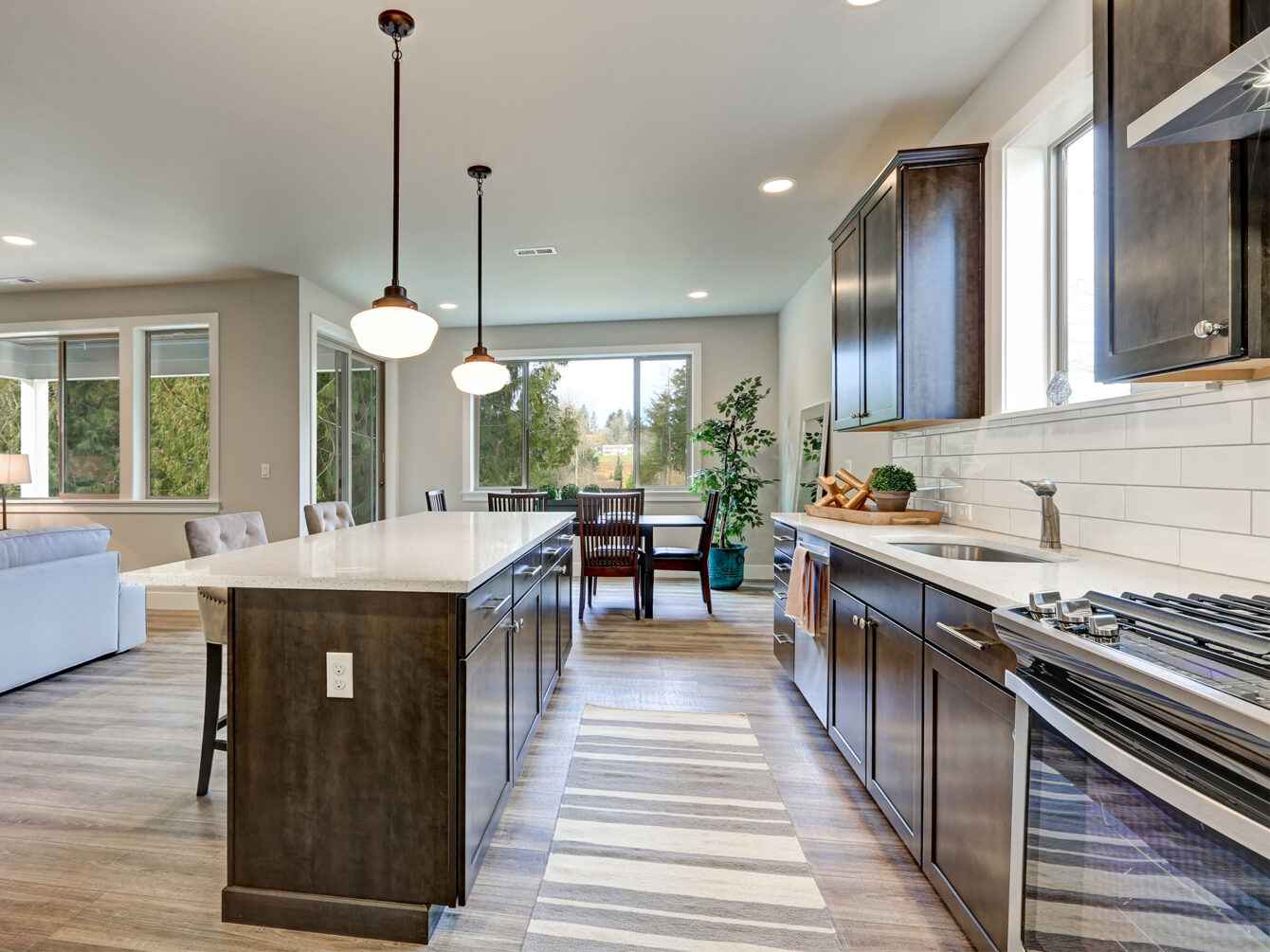 Is there anything more fun than completely reimagining a room you use every day? While any kind of transformation can be exciting, few projects compare to the possibilities the kitchen holds. And with expert kitchen designers like the Home Renew team on your side, the sky is the limit when it comes to your options. We strive to give Oklahoma City homeowners essentially a blank slate to work with, as there is no area of a kitchen our builders can’t improve.Custom kitchen with dark cabinetry, patterned wood flooring, and brick backsplash